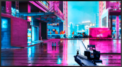 A screen shows a city background. There is a motion of the screen cropping the width or height according to UHD, Ultra WQHD or Dual QHD. A screen shows a city background. There is a motion of the screen cropping the width or height according to UHD, Ultra WQHD or Dual QHD.